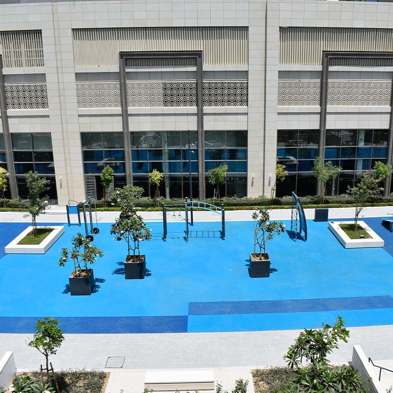This marine themed shaded play area in Dubai features two large sea creatures and an outdoor sports area