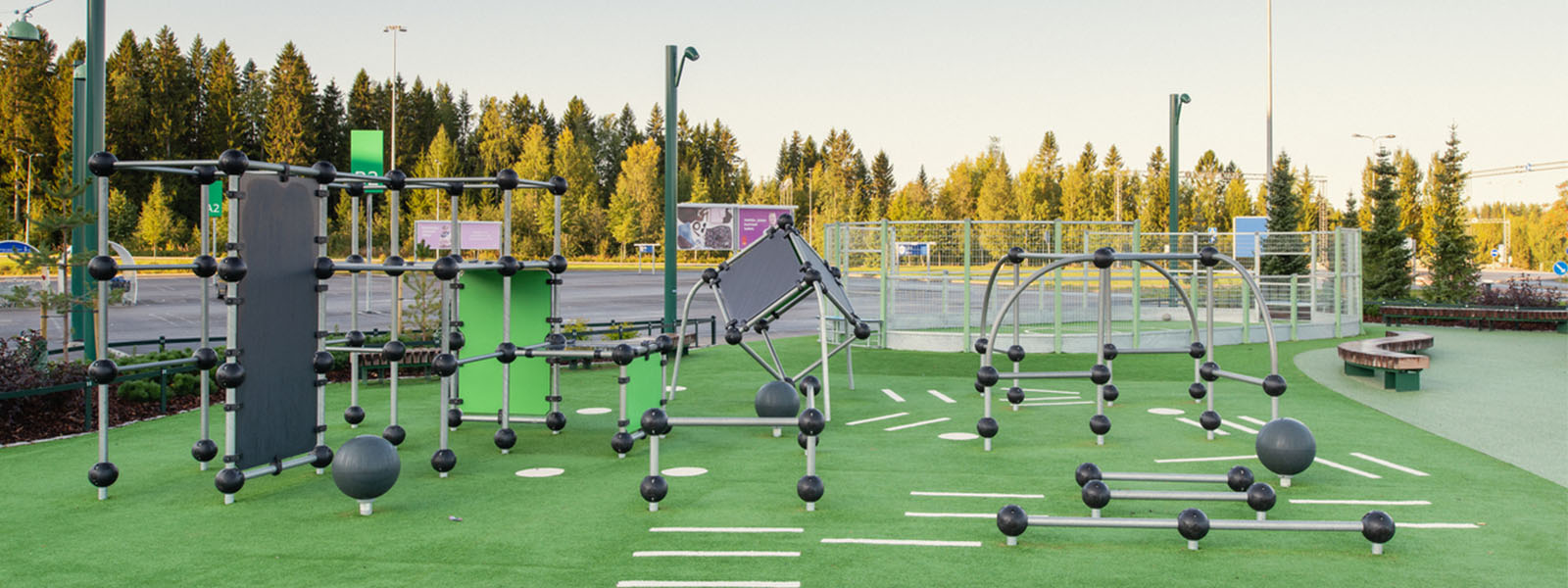 Gentle colors that complement the surrounding nature of the Savo region, Olopuisto is an oasis of play and adventure, nestled in the calm and tranquil setting of central Finland. Separated into areas based on age-appropriate equipment, Olopuisto at Matkus Shopping Center is sure to attract families for not only the retail opportunities, but also for the abundance of play and sport equipment that will entertain and engage users for years to come.