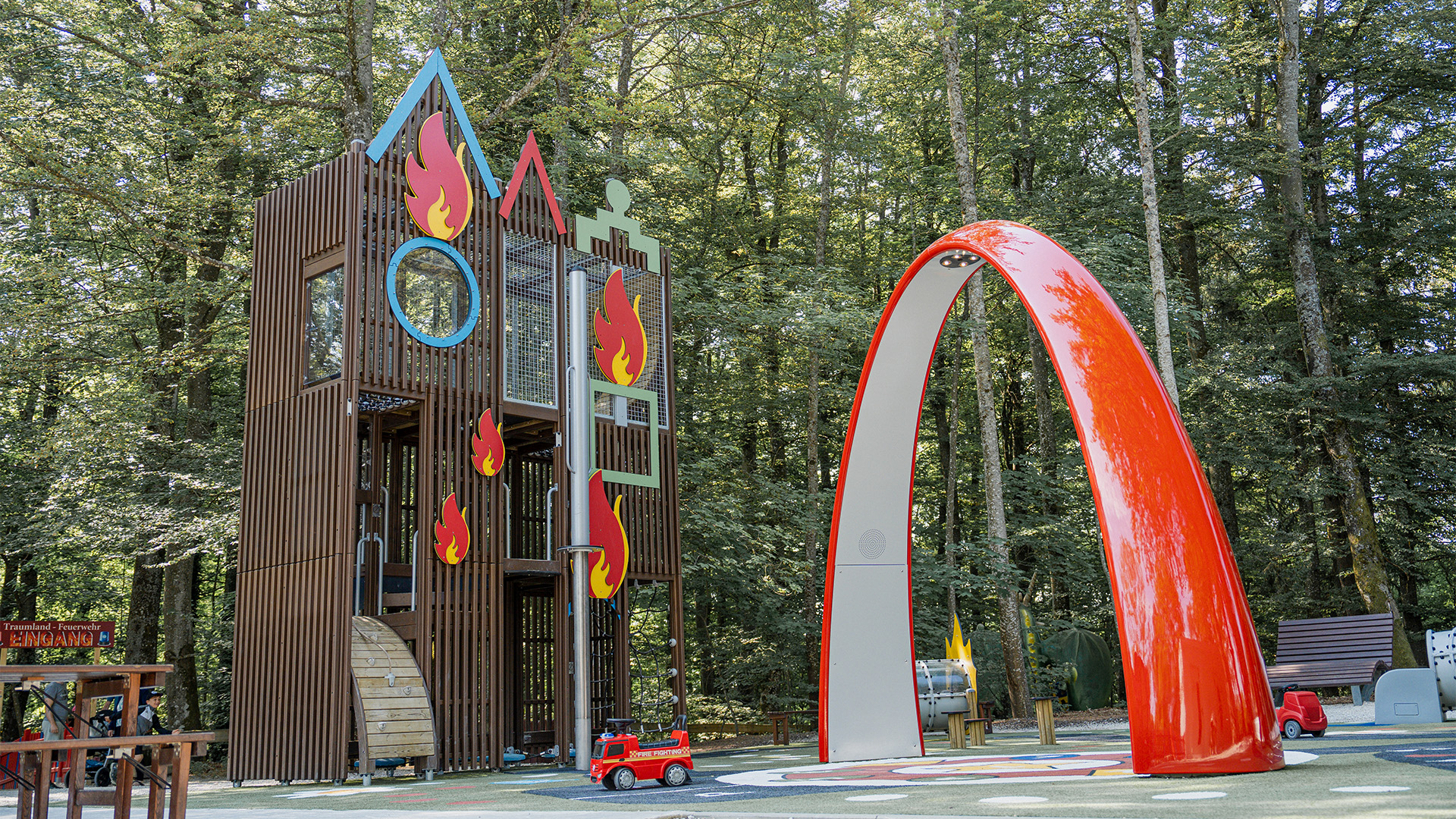 Traumland es un parque para niños ubicado en un parque de atracciones en Alemania. Este emocionante parque está diseñado en torno a la tématica de los bomberos. Cuenta con un gran tobogán en espiral por donde los niños pueden deslizarse como si estuvieran bajando por una manguera de bomberos. La estructura de madera roja se asemeja a una estación de bomberos en miniatura. El parque cuenta con todo tipo de coches de bomberos y el material sueva y acolchado garantiza la seguridad mientras juegan. Sin ninguna duda, es un lugar donde los más pequeños pueden jugar y soñar con ser bomberos de verdad