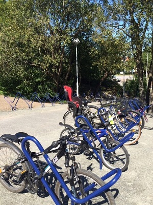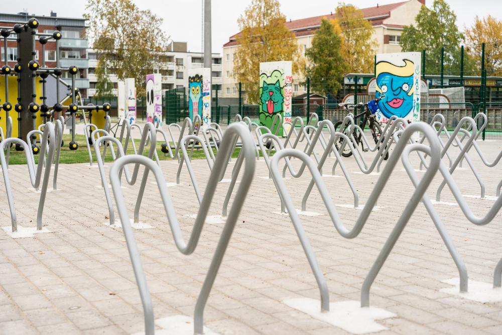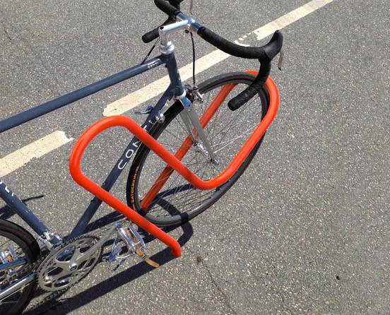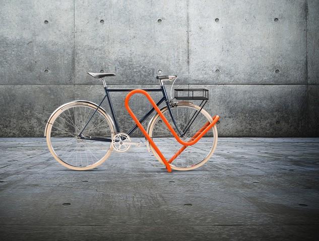 Heart-shaped cycle rack. Heart is a cycle rack in the shape of an elongated heart. The design allows both the cycle wheels and frame to be securely locked. The heart-shaped rack can stand alone or be set up in a row of racks.