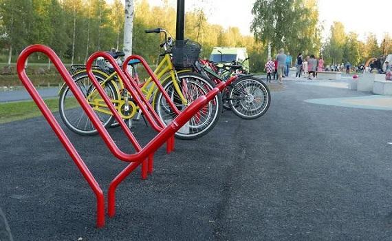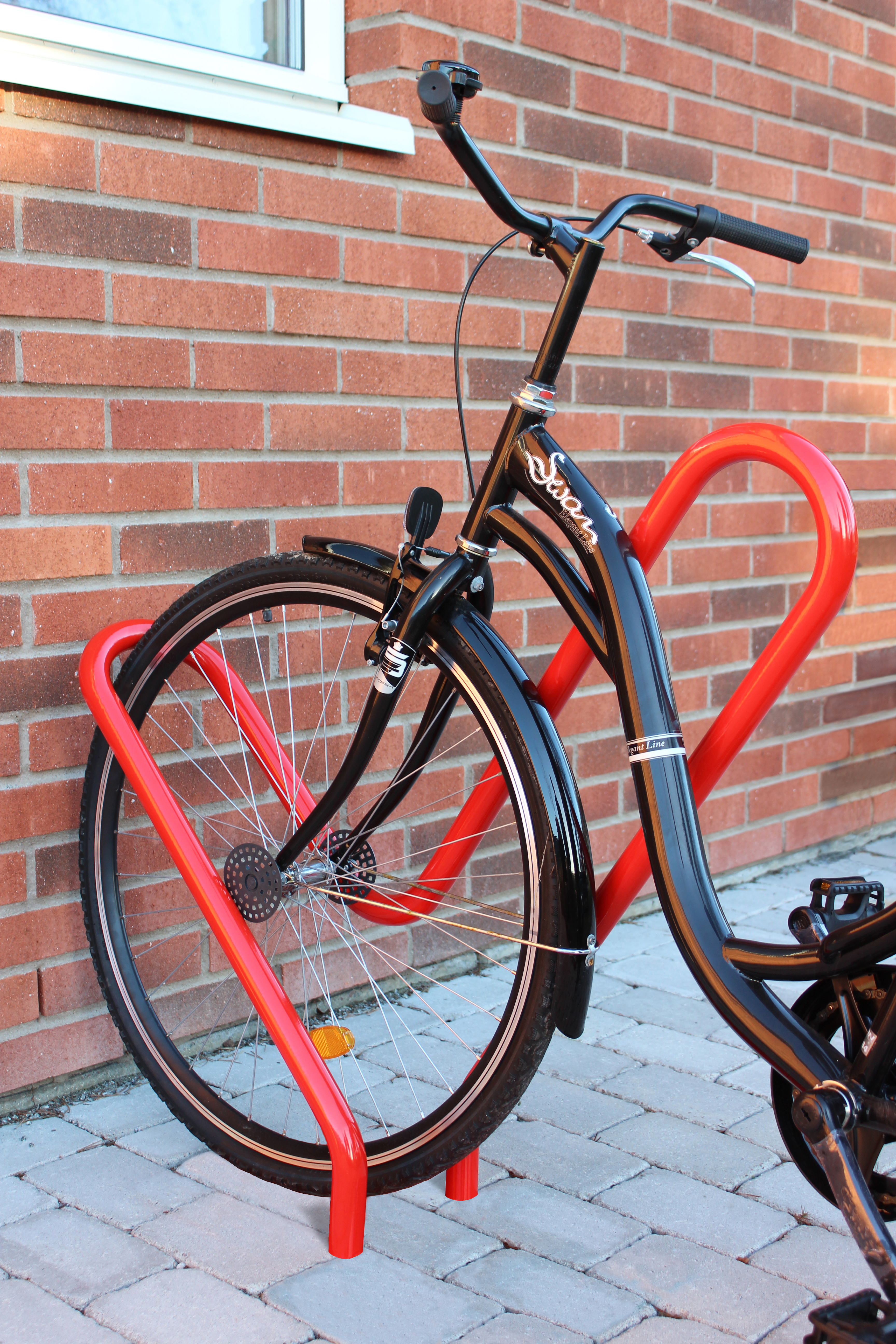 Heart-shaped cycle rack. Heart is a cycle rack in the shape of an elongated heart. The design allows both the cycle wheels and frame to be securely locked. The heart-shaped rack can stand alone or be set up in a row of racks.