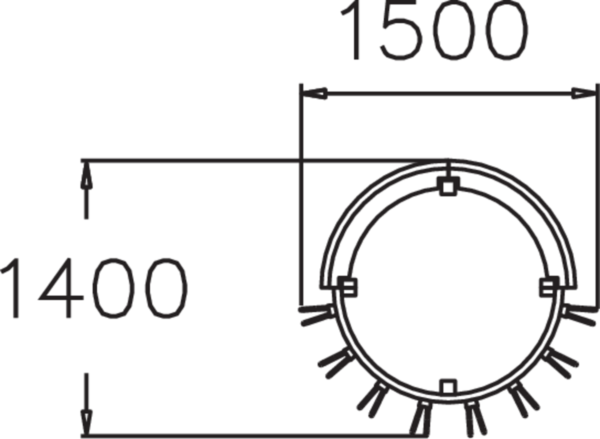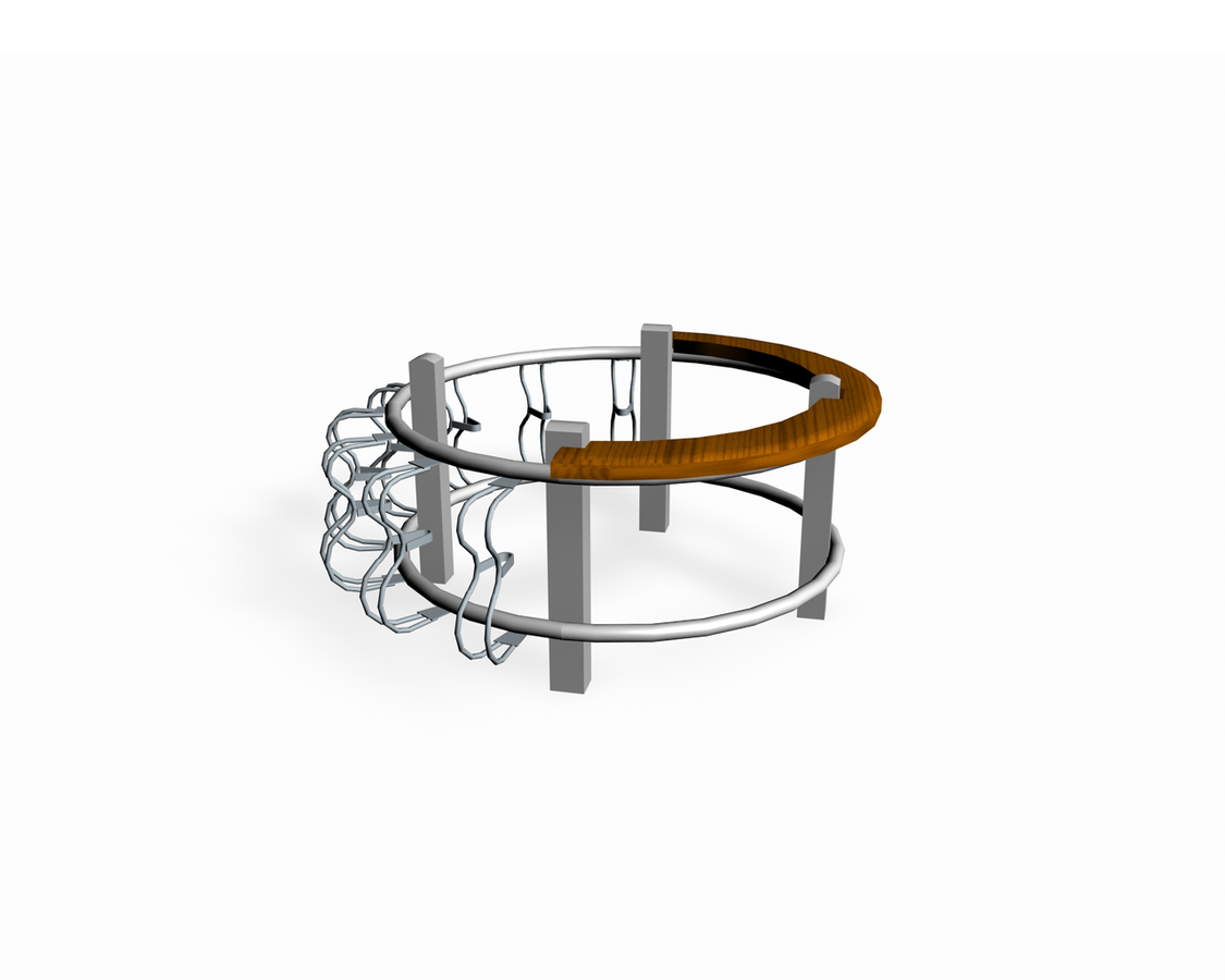 Semi circular bicycle rack+ semi circular railing wioth plank seat.