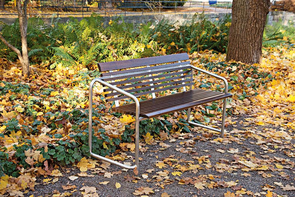 Stackable park bench. Lappset's stackable, lightweight Bosse bench weighs a mere 16 kg. This stylish park bench has a wooden seat and back support, while the frame is made of clear-lacquered aluminium. The bench is free-standing and is suitable for public squares, gardens, courtyards or terraces.