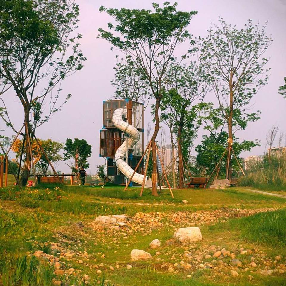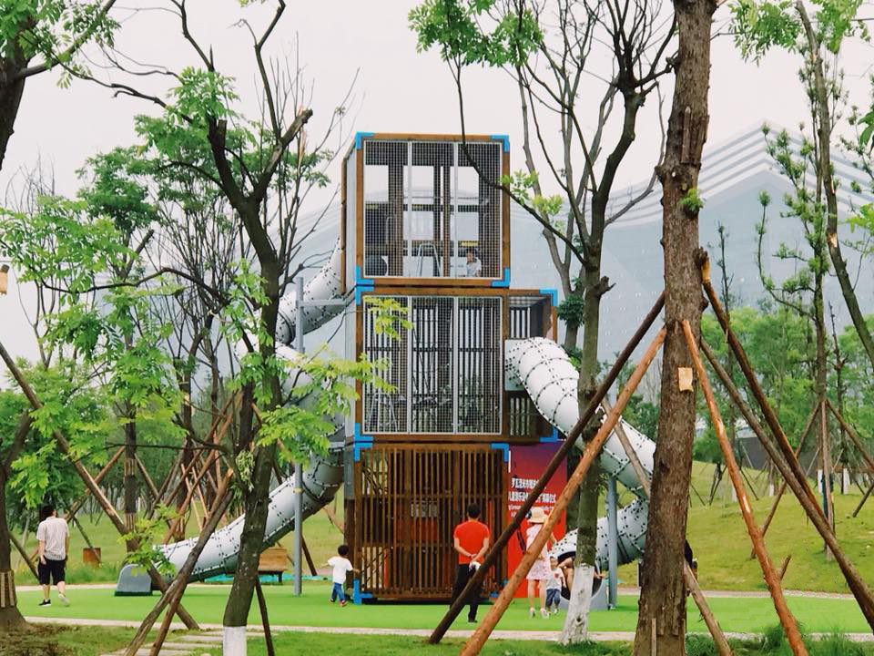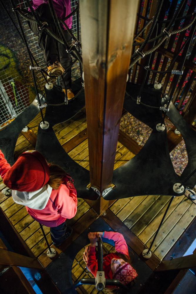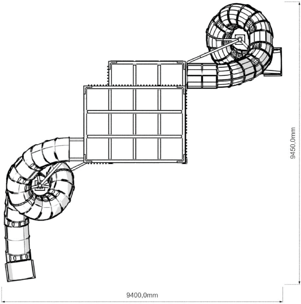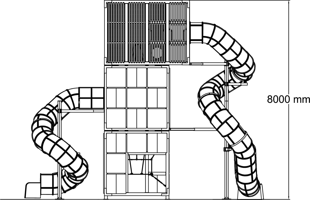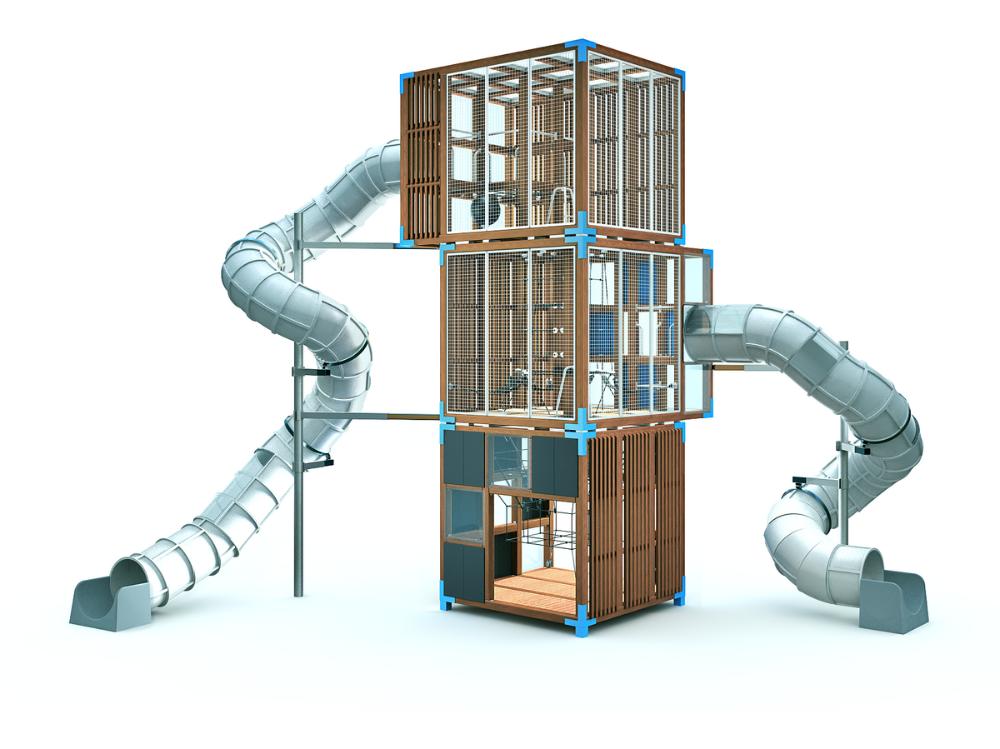 Height is a fundamental element of exciting play. Rising to nearly 8 metres, this tower consists of three elements (a cube and two cuboids on top of each other) and offers users chances for truly testing their limits. How high do you dare to climb? Are you brave enough to walk on the transparent floor? Will you climb down or speed down one of the two tube slides? Tube slides are available also in stainless steel.