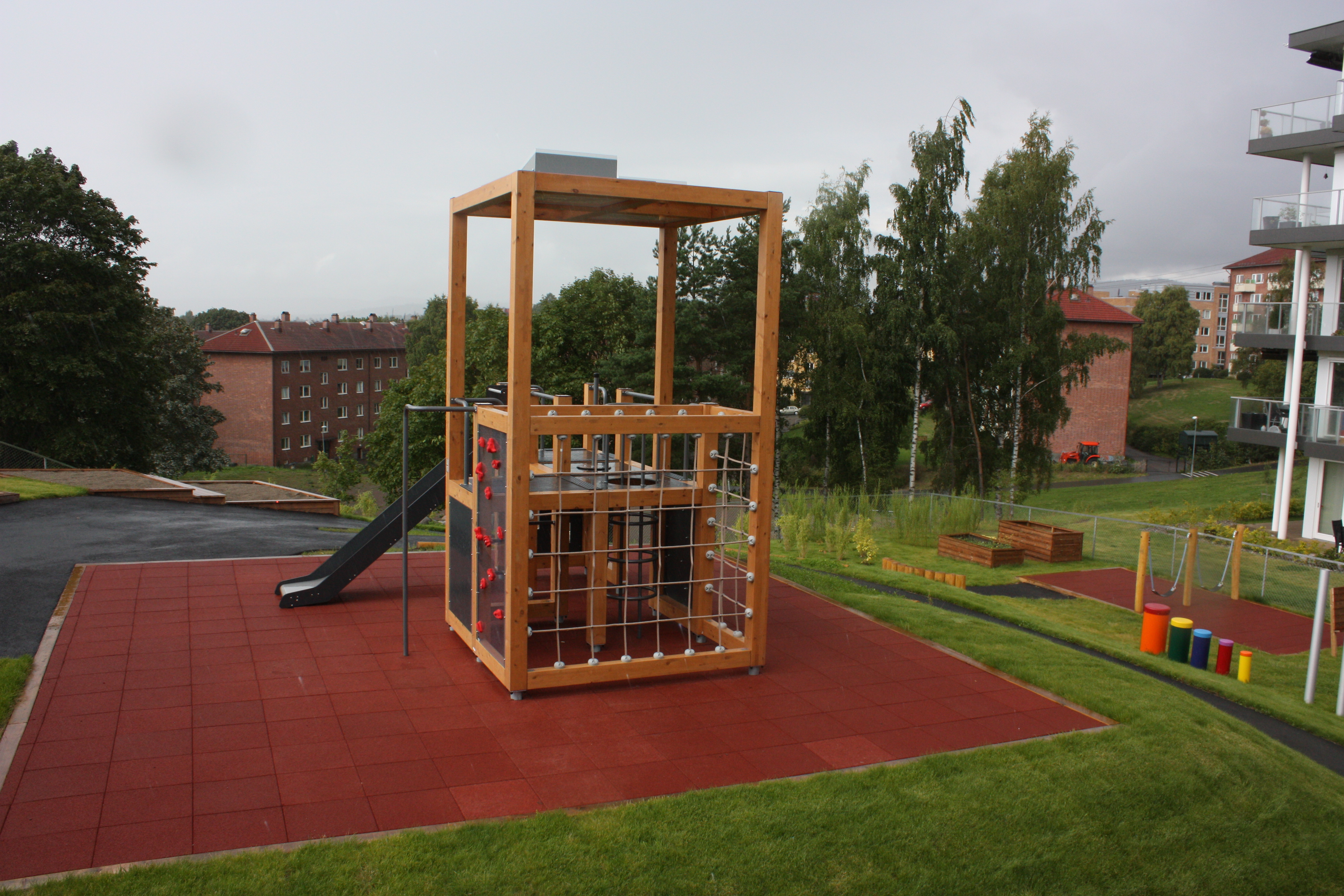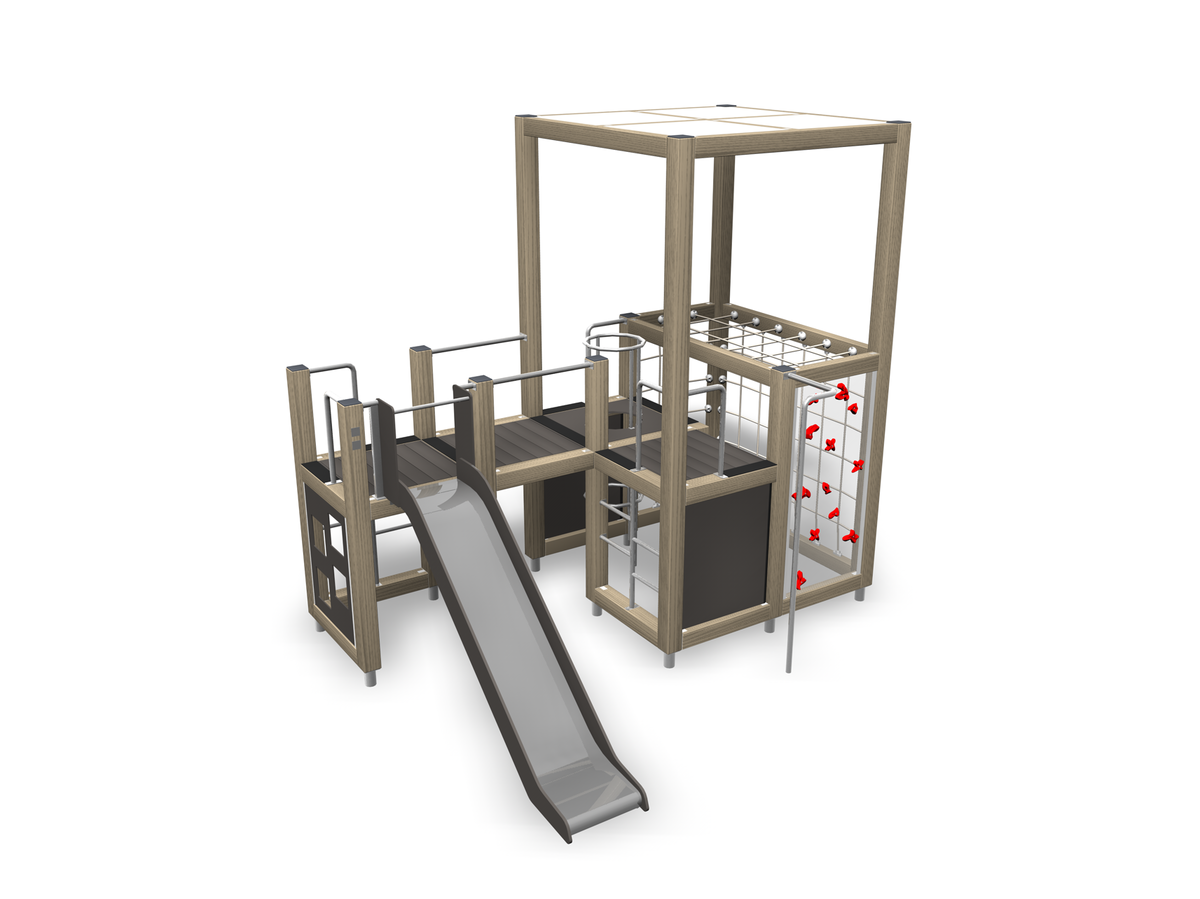 Multifunctional, modern activity tower with innovative solutions, such as the graphic design of the steps and the see-through climbing wall. The set also includes a long slide, climbing wall, three climbing nets, fireman's ladder, fireman’s pole, a labyrinth wall and a see-through roof. The platform is placed at 1,470 mm. The transparent roof panels allow light to pass through during the day, while the optional solar panels store it to power ambient lighting at night. The Halo Activity Tower has more functionality per square metre than most playground equipment, which means it can fit more children at one time. This novel piece of equipment is exciting for kids, and its diverse climbing options work in many ways to develop their strength and balance.