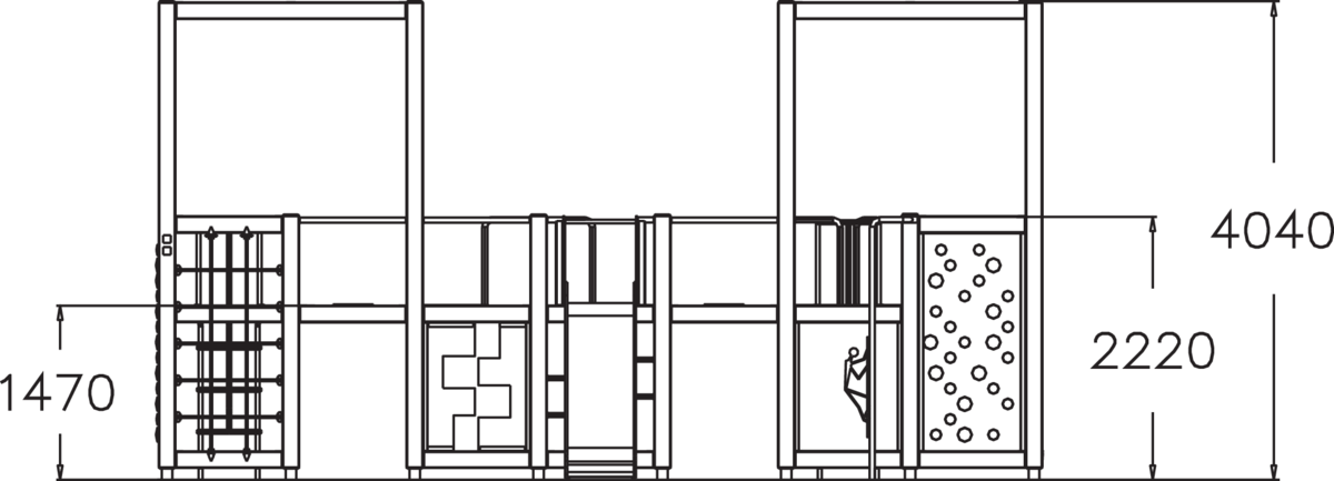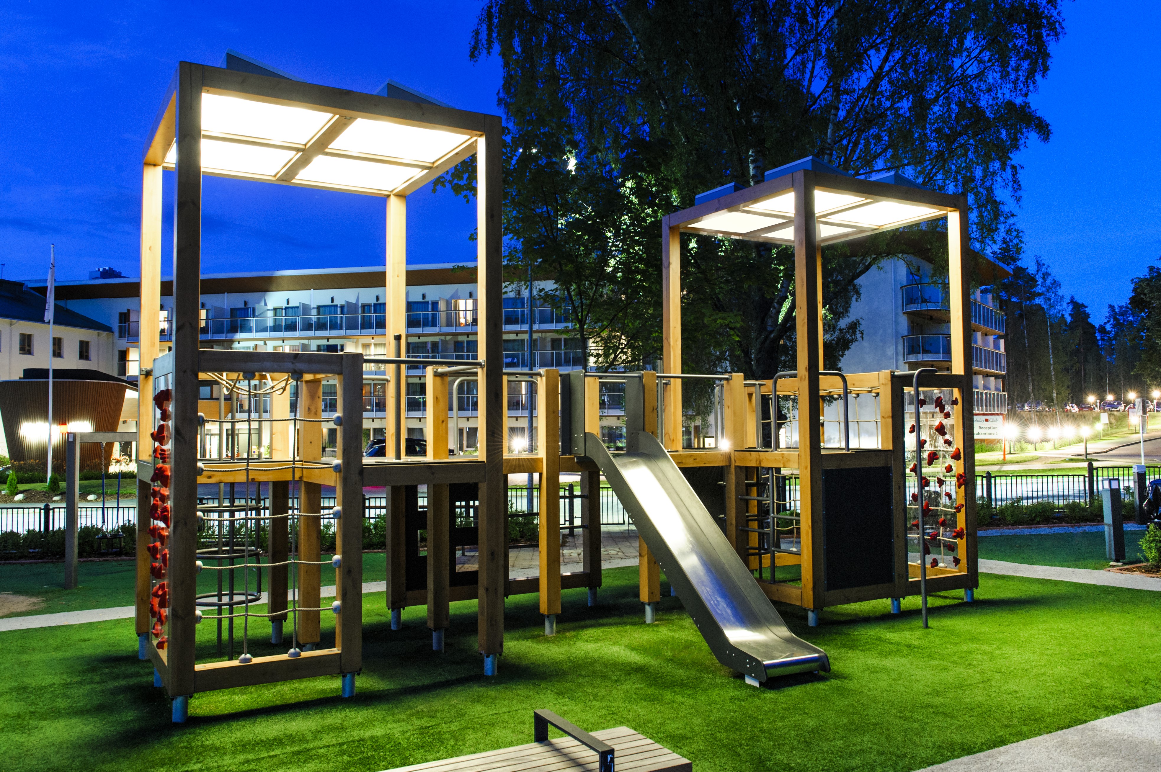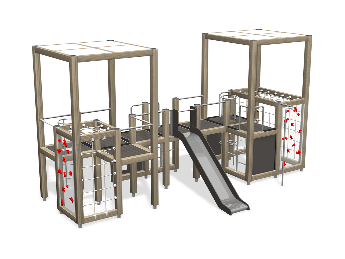 Multifunctional, modern tower set with innovative solutions, such as the graphic design of the steps and the two see-through climbing walls. The set also includes a long slide, climbing wall, five climbing nets, two fireman's ladders, a labyrinth wall, four step ladders, fireman's pole and two see-through roofs. The transparent roof panels allow light to pass through during the day, while the optional solar panels store it to power ambient lighting at night. The Halo Activity Tower has more functionality per square metre than most playground equipment, which means it can fit more children at one time. This novel piece of equipment is exciting for kids, and its diverse climbing options work in many ways to develop their strength and balance.