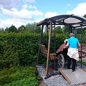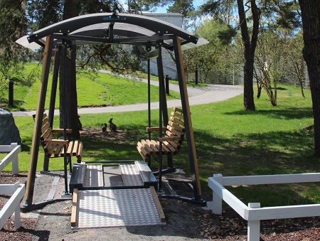 Aluminum ramp to Oasis swing for wheel chair and rollator users.