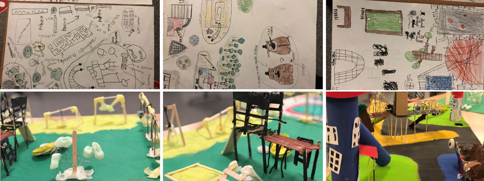 Oppilaiden piirtämät pihasuunnitelmat ja ryhmissä tehdyt pienoismallit