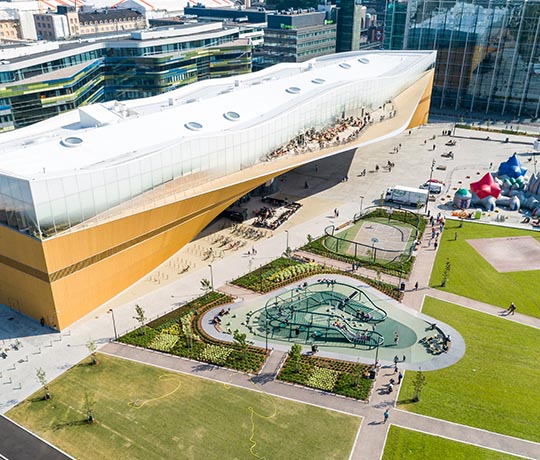 Kiipeily valtavalla metalliverkolla on kutkuttavan hauskaa. Leikkiarvoa lisäävät linnunpesäkeinut ja tasapainoiluelementit. Verkkokiipeilyteline sijaitsee uudessa, monipuoliseksi kaupunkitilaksi tarkoitetussa Makasiinipuistossa keskellä Helsinkiä. Maisema-arkkitehdin tavoitteena oli suunnitella veistosmainen kokonaisuus, joka sointuu modernin ja selkeälinjaisen keskustakirjasto Oodin ja sen ympäristön muotokieleen sekä mittakaavaan. Tämä projekti on hyvä esimerkki siitä, miten voimme toteuttaa asiakkaiden toiveita ja luoda uniikkeja leikkipuistoja.